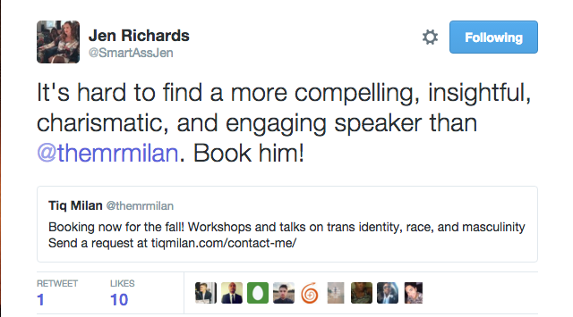 "Tiq Milan is one hell of a force of nature. He’s a media maker. He’s a journalist. He’s a human rights advocate. A father. He is a vital voice within the trans community.